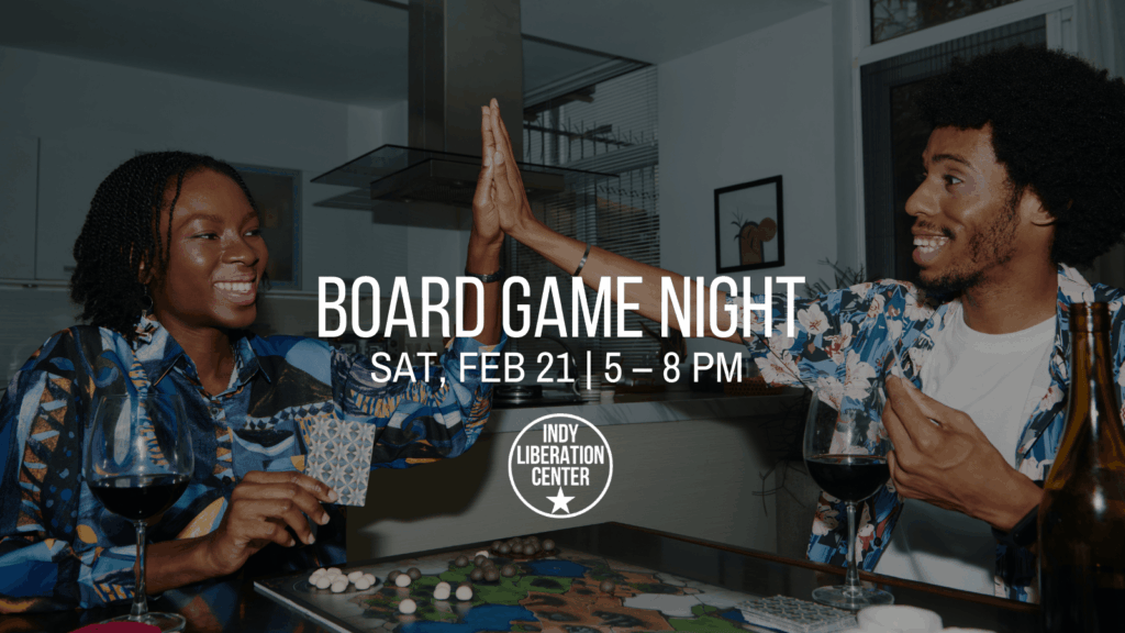Come Play: A night of Black joy & community games Indianapolis Liberation Center Come through and show your skills with games significant to Black American and New Afrikan culture. Kids welcome!