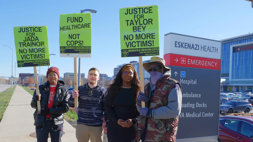 First, we supported Jada Trainor in her years-long struggle against the police and prosecutor. On July 13, 2024, Jada, a Black woman, U.S. veteran, and mother was violently attacked by three uniformed officers at Eskenazi Hospital, charged with serious felonies, and forced to spend over a day in jail, where she nearly died from neglect. Since she came to the Center for help afterwards in 2024 and the end of 2025, we stood by their side, holding protests and other actions as Marion County Prosecutor Ryan Mears dragged out trial proceedings. Then, on October 1, Jada won a significant and rare victory against the police and prosecutors in a jury trial. We will continue to stand with her and her family until the last bogus charge is dropped.