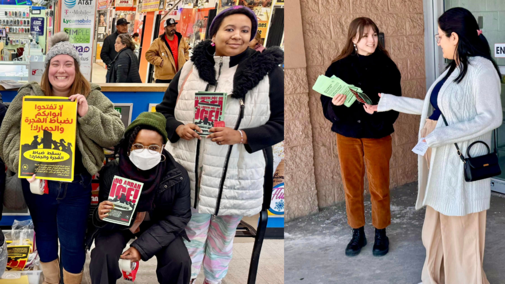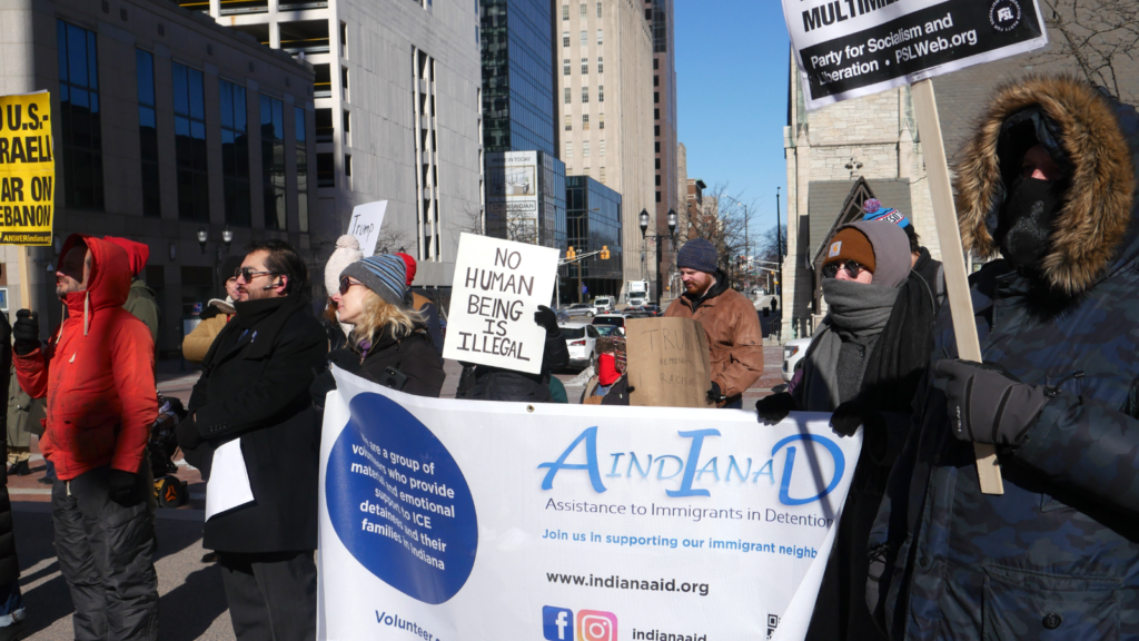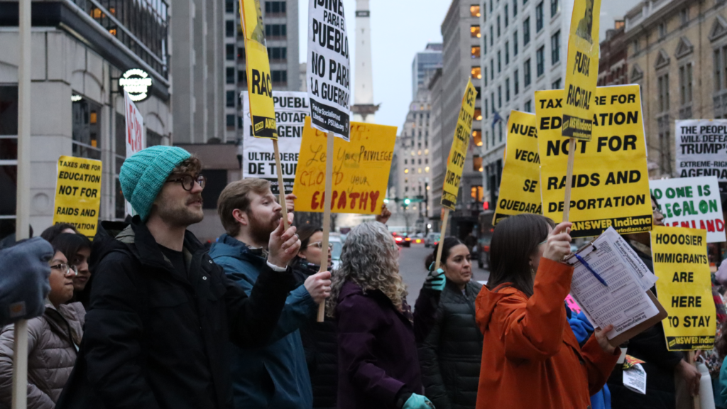 Over this past year, dozens of large pro-immigrant demonstrations swept Indianapolis. We didn’t stop after January 20 but continued doing outreach to community members, businesses, and other institutions. We were up early on January 29 as House Bill 1158, which would mandate the Sheriff’s cooperation with ICE, was introduced in the House. Our bodies and signs showed the people oppose any ICE escalation. HB 1158 never made it out of committee.