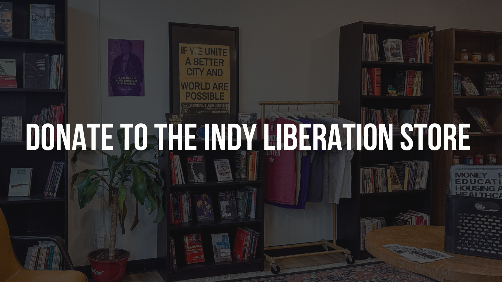 The Indy Liberation Store is built by and for our community. We welcome ongoing donations of radical books and movement art to stock our shelves and sustain our space. Your donated items are sold in our storefront, with every dollar fueling the Indy Liberation Center’s mission to educate, agitate, and organize right here in Indianapolis.