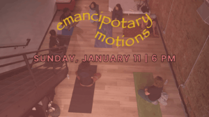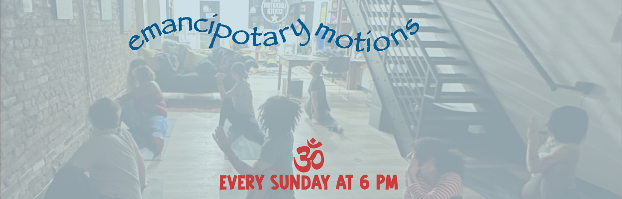 Emancipatory Motions is a yoga practice that repairs the damage this alienation causes by reconnecting us with our selves as beings in complex motion–together. They meet at the Liberation Center every Sunday at 6 pm. To support the facilitator, group, and the Center, we ask for a donation, although no one is turned away for a lack (or excess) of funds.