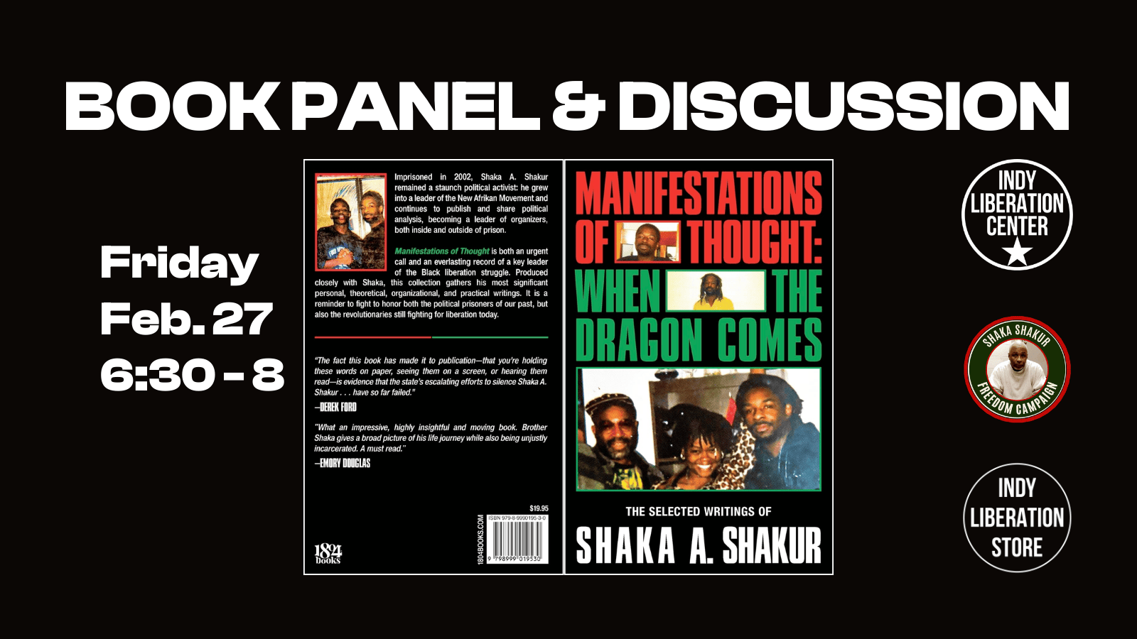 Start your weekend off with an important panel discussion on New Afrikan Political Prisoner Shaka A. Shakur’s first book, Manifestations of Thought: When the Dragon Comes (1804 Books).